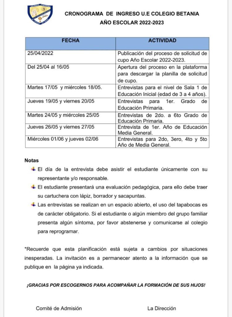 A continuación, se detalla la información referente al proceso de admisión de la U.E Colegio Betania, Año Escolar 2022-2023:
